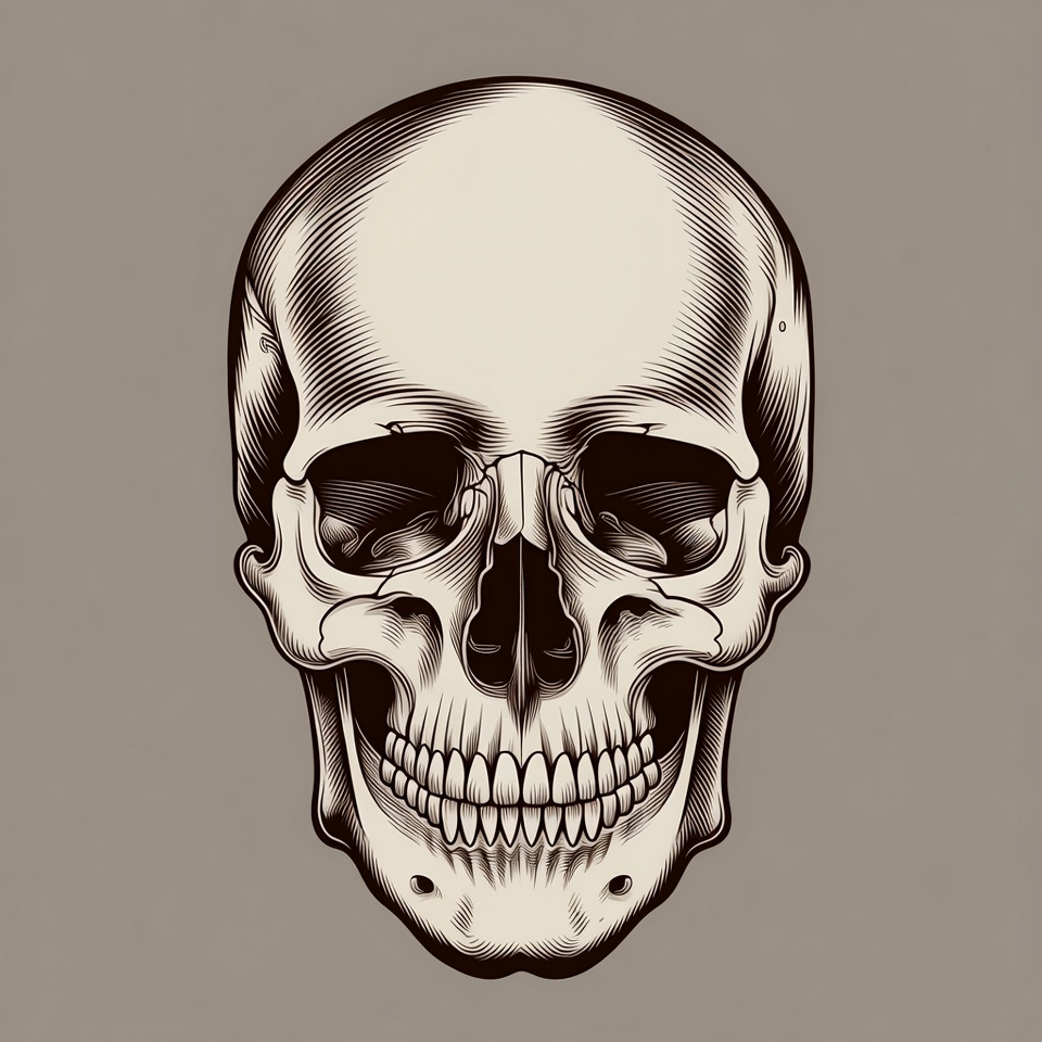 anatomy, bones, crosshatching, death symbol, detailed drawing, eye sockets, front view, grayscale, human skull, illustration, isolated background, jawbone, line art, skeleton, teeth, skull