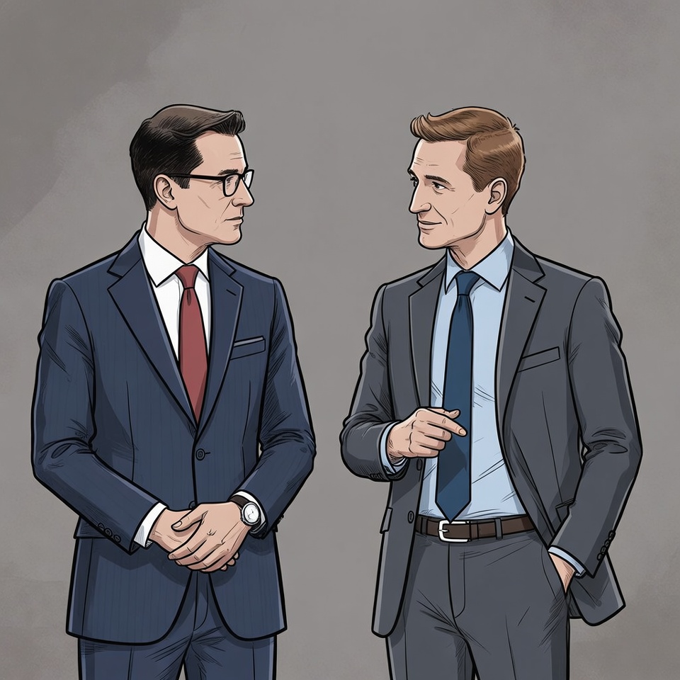 An illustration depicts two White men in business suits standing and facing each other on a plain gray background. The man on the left wears a dark blue suit, white shirt, red tie, and glasses, with his hands clasped in front. The man on the right wears a gray suit, light blue shirt, blue tie, gesturing with one hand while the other is in his pocket.