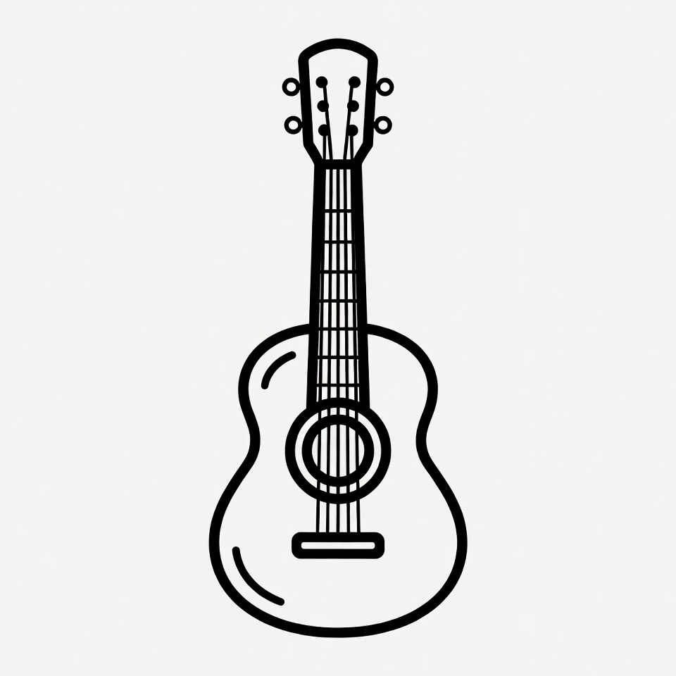 black and white, body, chord, clipart, drawing, frets, guitar, illustration, isolated background, line art, music, musical instrument, neck, outline, simple, sound hole, strings, strumming, vector, acoustic guitar