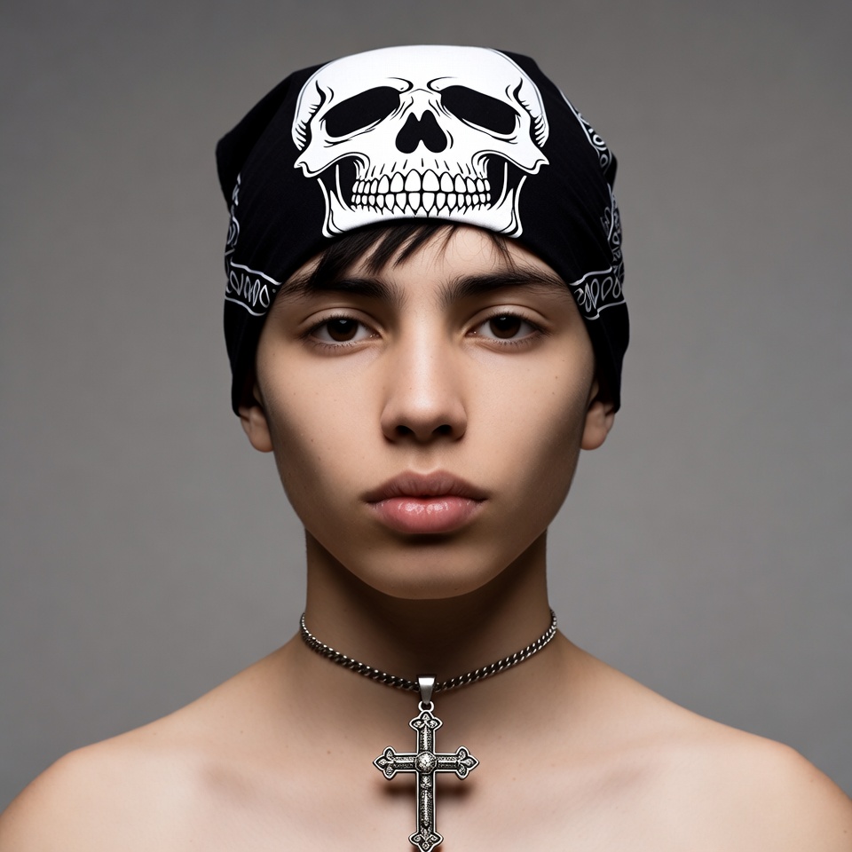An androgynous young person with short dark hair and subtle makeup stares directly at the camera against a gray background. They wear a black bandana printed with a large white skull and a silver chain necklace with a prominent cross pendant. Their shoulders are bare, revealing smooth skin.
