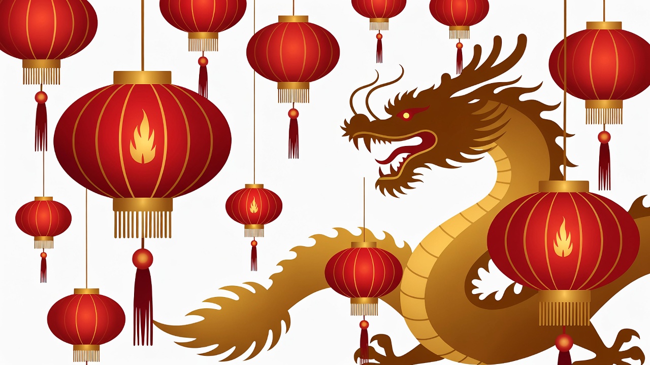 A fierce brown Chinese dragon with golden horns and flames snarls amid hanging red lanterns. The lanterns feature intricate gold designs and tassels, suspended on strings. The illustration is set against a white background.