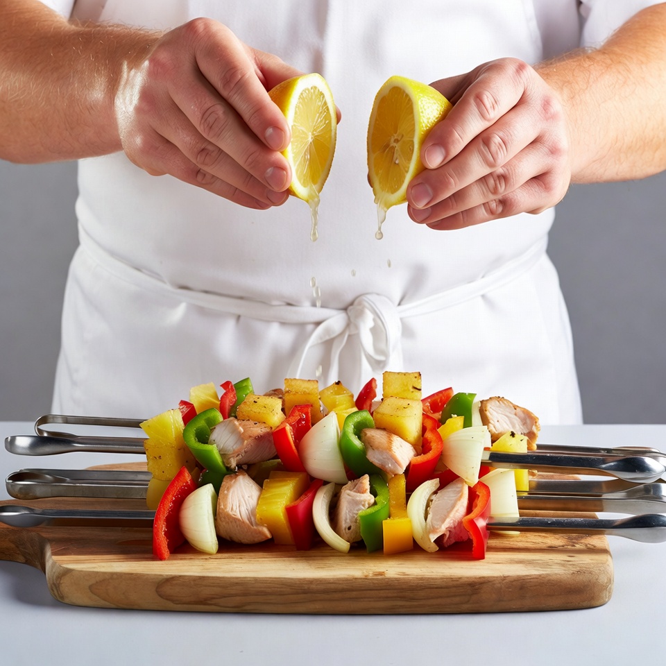 A man in a white chef uniform squeezes juice from two halved lemons over skewers of grilled chicken, pineapple, bell peppers, and onions on a wooden board. Lemon juice drips onto the colorful kebabs arranged neatly. Metal tongs rest beside the skewers on a gray background.