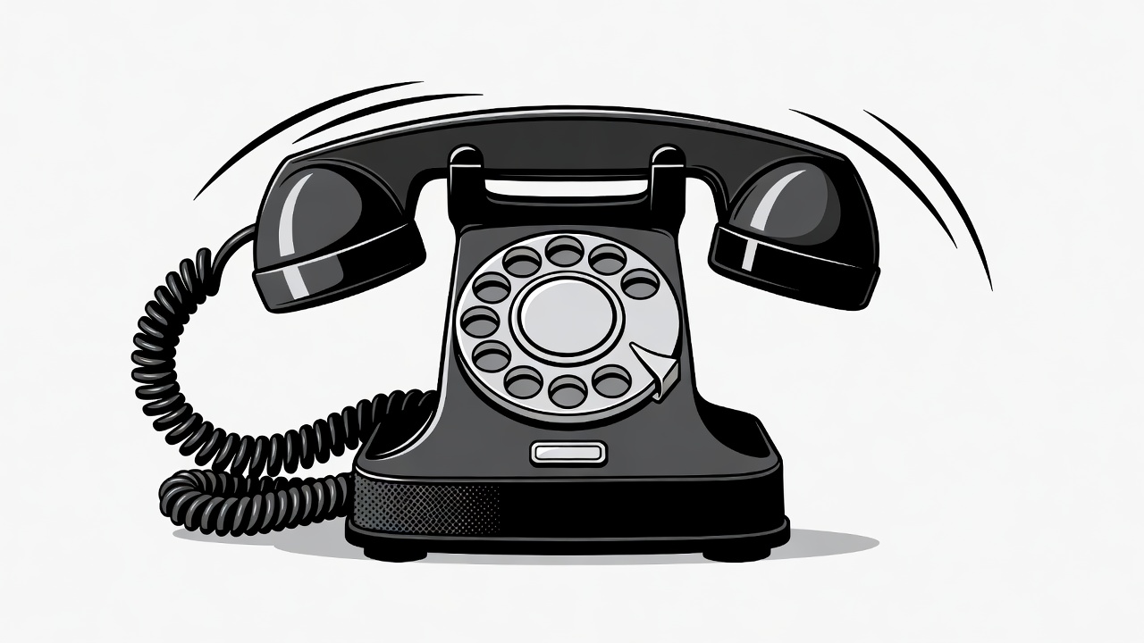 A black vintage rotary telephone with a coiled cord is depicted in a dynamic illustration, ringing with motion lines around the swinging handset. The phone features a circular dial and sits on a plain white background. The style is bold line art with shading for a cartoonish effect.