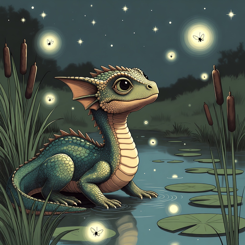 A cute green baby dragon with large eyes sits among reeds and lily pads in a dark swampy pond. Fireflies glow around it, illuminating the starry night sky and reflective water. The illustration features detailed scales, fins, and a serene natural setting.