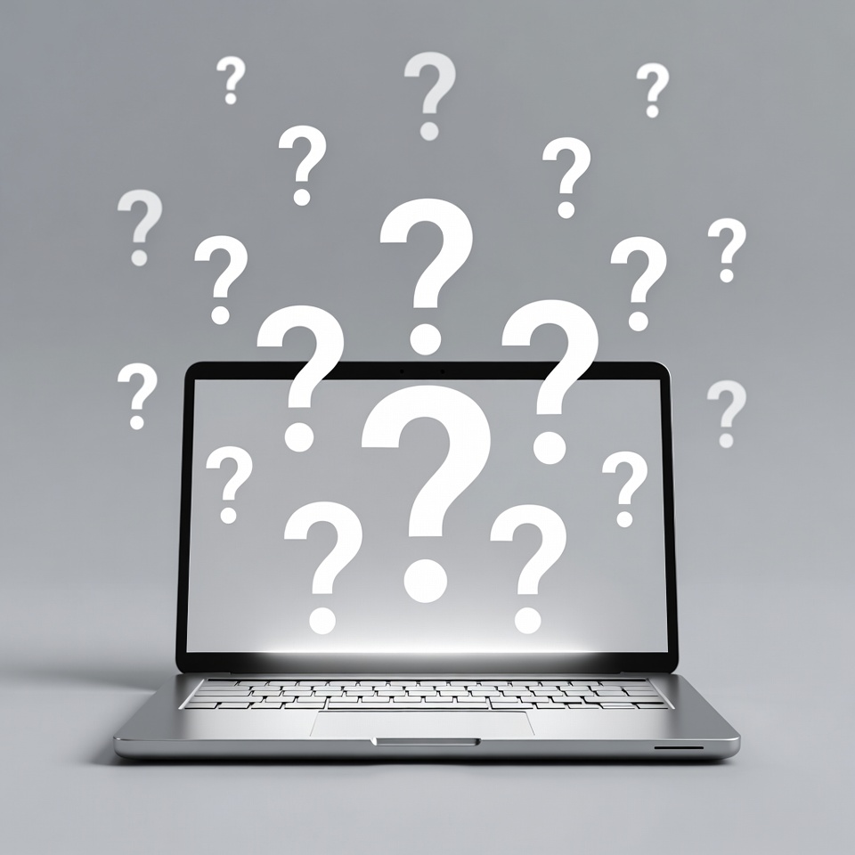 clipart, computer screen, confusion symbol, floating icons, gray background, illustration, inquiry graphic, isolated background, laptop display, question icon, question marks, silver laptop, tech graphic, white icons, laptop