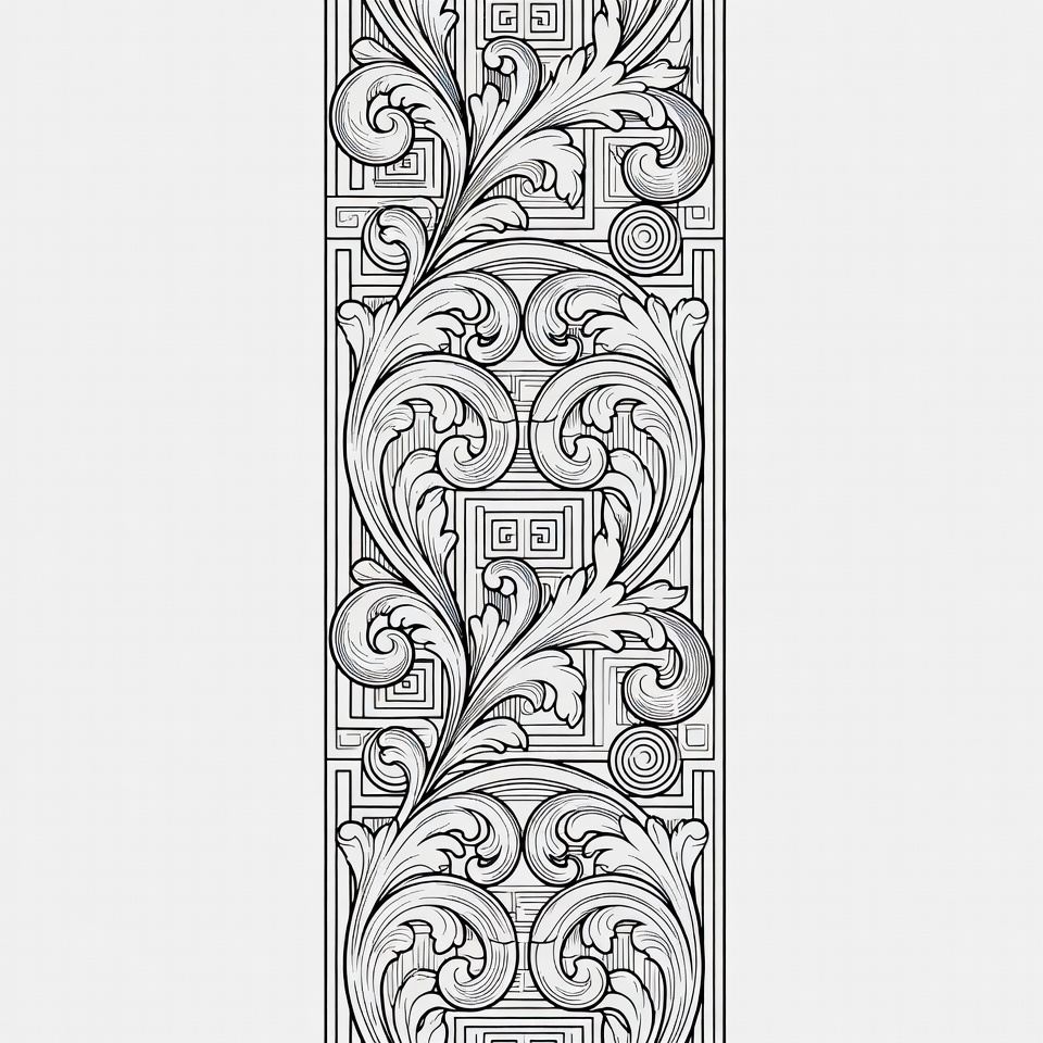 A tall, vertical black and white line art illustration features intricate floral and geometric patterns. Swirling leaves, acanthus motifs, and interlocking squares form an elegant border design. The pattern is symmetrical and isolated on a white background.