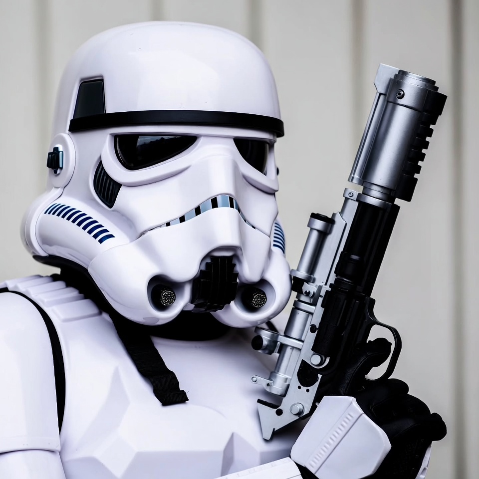 Imperial trooper, Star Wars, black gloves, blaster gun, blaster rifle, cosplay, futuristic weapon, helmet, isolated, red markings, sci-fi soldier, studio background, white armor, Stormtrooper