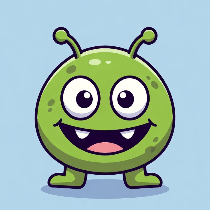 A cheerful green alien character with large eyes, antennae, and a wide smile featuring sharp teeth stands on short legs. The illustration has a glossy, textured appearance and is set against a solid light blue background. It is presented in a vibrant cartoon style.