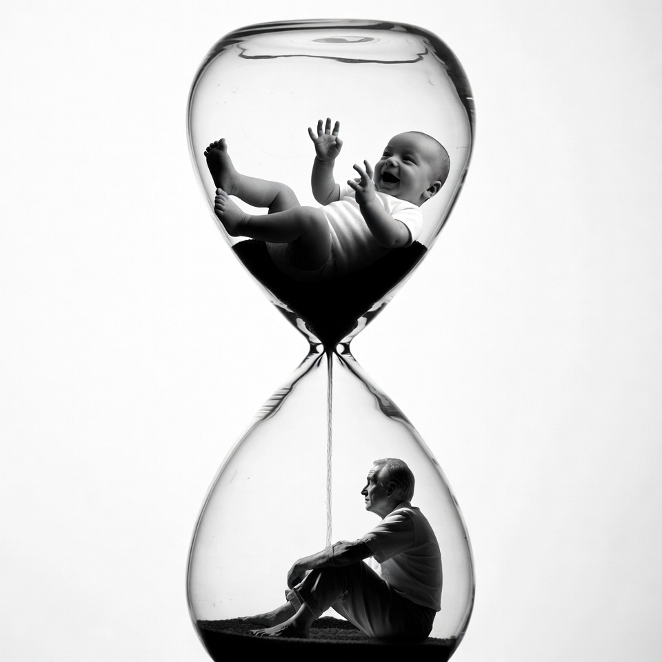 A black and white photograph shows a laughing baby in the upper bulb of a large glass hourglass, with arms raised and legs kicking. Sand fills the middle and lower bulb where an elderly man sits pensively with legs crossed. The isolated white background emphasizes the symbolic time contrast between youth and age.