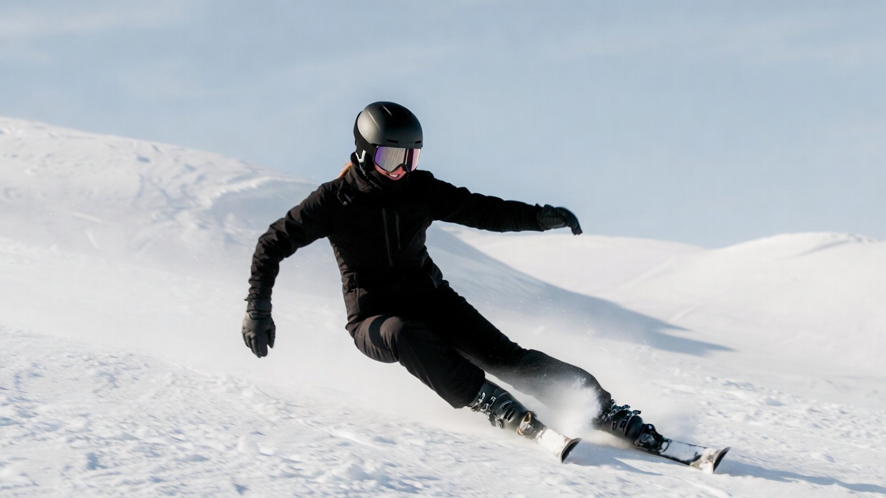 A woman in black ski gear and helmet skis dynamically down a snowy mountain slope. She wears goggles and gloves, with snow spraying from her skis. The bright winter landscape features white snow under a clear sky.
