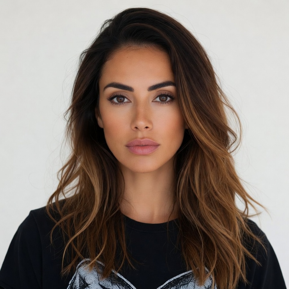 A young woman with long, wavy dark brown hair and striking brown eyes gazes directly at the camera. She has flawless makeup with defined brows and glossy lips, wearing a black top on a plain white background. Her expression is confident and alluring.