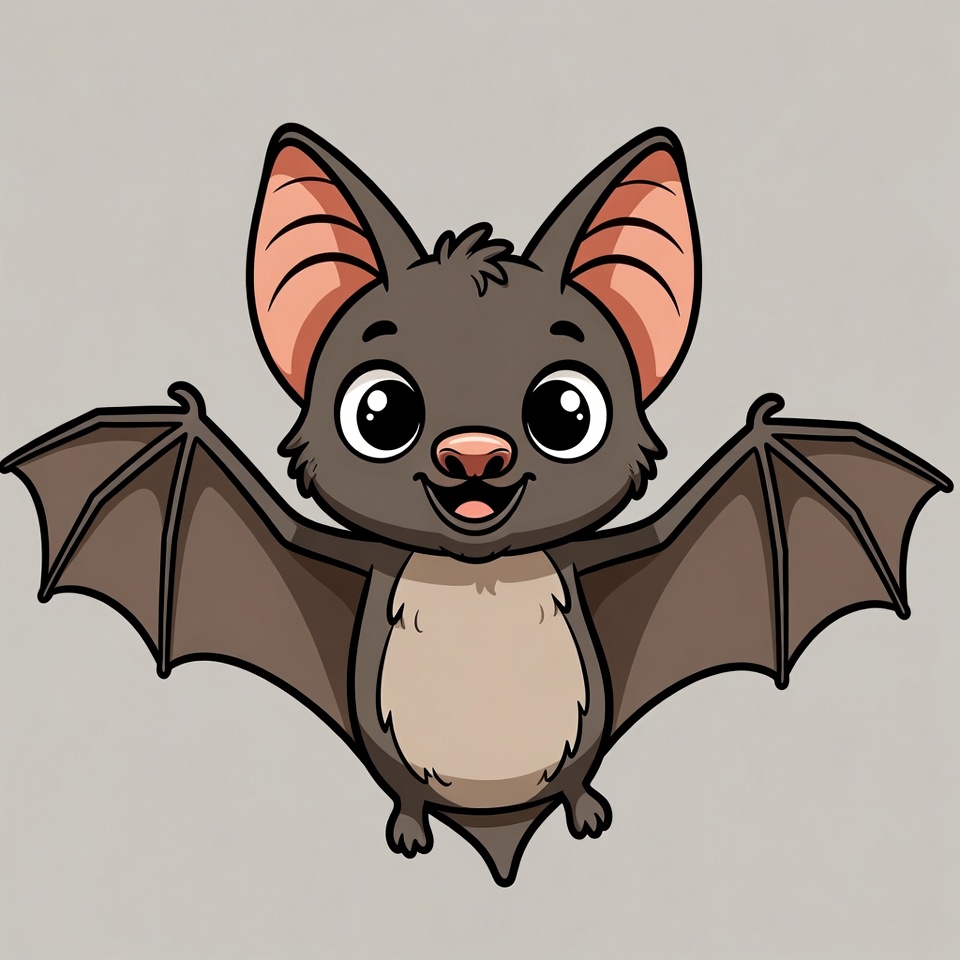 A cute cartoon bat with large expressive eyes and a smiling mouth spreads its brown wings wide. It has fuzzy brown fur, pink inner ears, and a light tan belly. The bat is illustrated in a playful style against a plain gray background.
