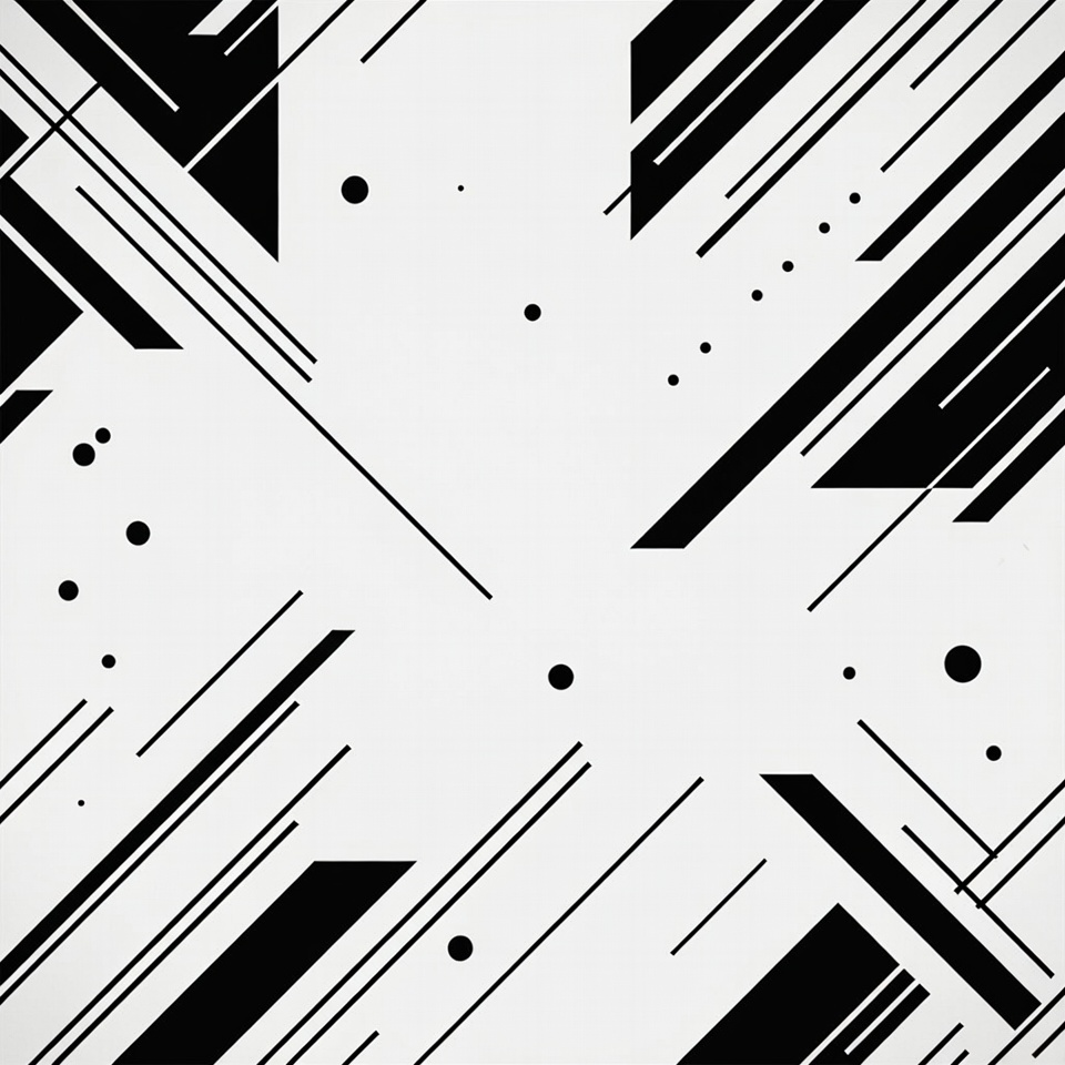 An abstract composition features bold black diagonal lines intersecting across a white background. Small black dots are scattered throughout the design, adding texture and balance. Thick and thin lines create dynamic geometric patterns in a minimalist style.