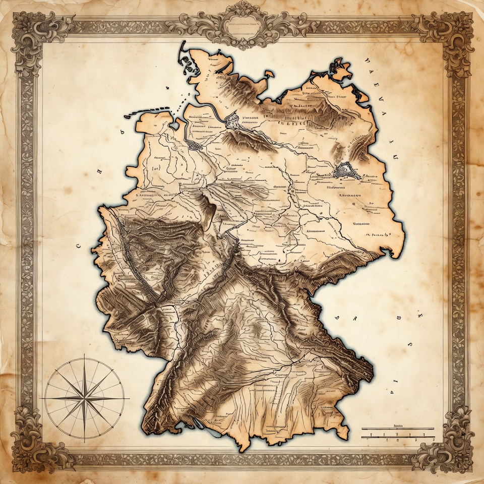 Europe map, aged paper, antique map, borders, cartography, compass rose, geographical map, hachured mountains, historical map, old map, ornate frame, rivers, sepia map, topography, vintage map, Germany map