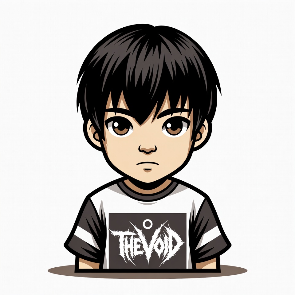 A cartoon illustration of a young Asian boy with short black hair and serious expression faces forward. He wears a black and white t-shirt featuring 'THE VOID' logo in bold letters with a circular symbol. The image has a clean, isolated white background with subtle shadow effects.