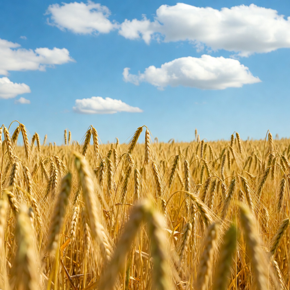 agriculture, blue sky, cereal crop, crop field, farmland, field landscape, golden wheat, grain field, harvest time, nature landscape, outdoor scenery, ripe wheat, summer field, sunny day, wheat crop, wheat stalks, white clouds, wheat field