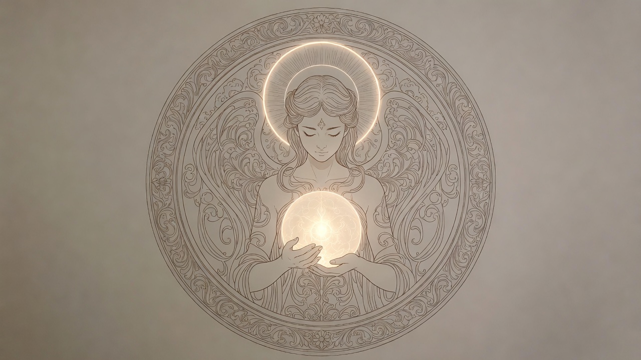 A serene angel with long flowing hair and a golden halo holds a luminous white orb in her hands. She is centered within an intricate circular frame of ornate floral and vine patterns on a light background. The illustration features delicate line art with glowing ethereal highlights.
