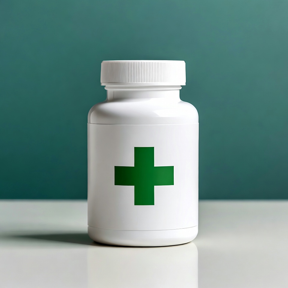 A white plastic medicine bottle with a white cap sits on a white surface. A green plus sign or cross is printed on the front of the bottle. The bottle is isolated against a teal background.