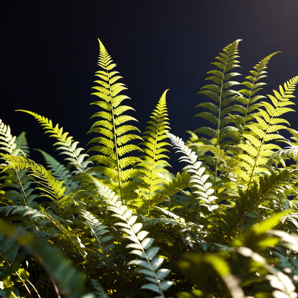 Lush green fern fronds with delicate leaves stand prominently against a solid black background. The ferns are brightly lit with sunlight, highlighting their intricate textures and vibrant color. Multiple fronds cluster together, creating a natural and detailed botanical display.