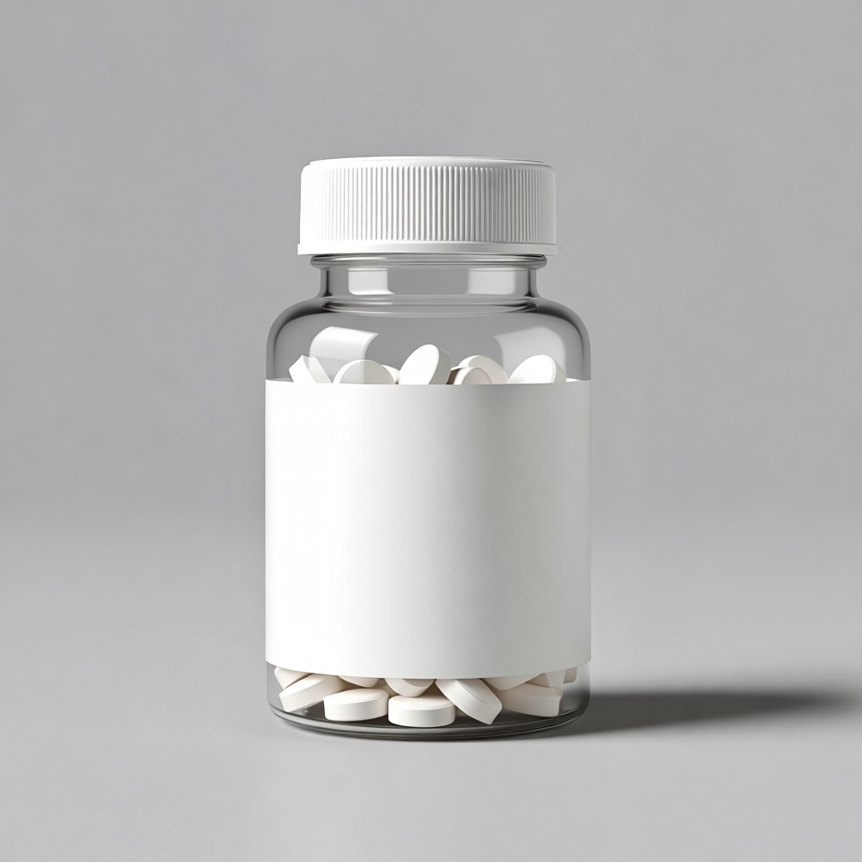 blank label, clear glass, drug bottle, glass bottle, health, isolated background, medication, pharmaceutical, pharmacy, pills, prescription bottle, white cap, white label, white pills, medicine bottle