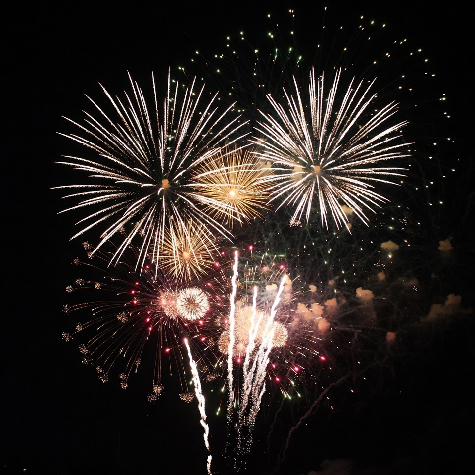 aerial fireworks, burst patterns, celebration lights, colorful fireworks, dark background, exploding fireworks, festive explosions, gold fireworks, green fireworks, light show, multi-colored sparks, night display, night sky, pyrotechnics, red fireworks, sparkling trails, starbursts, white fireworks, yellow fireworks, fireworks