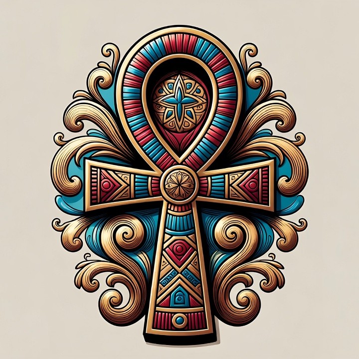 A detailed illustration of the ancient Egyptian Ankh symbol features a cross with a looped top. It is adorned with intricate gold, red, blue, and turquoise patterns and flourishes. The design is centered on a light beige background.