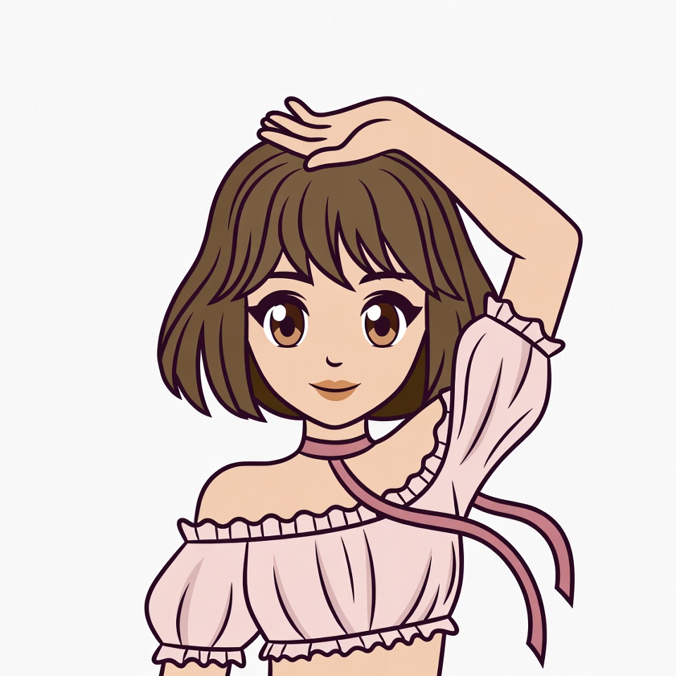 Asian, bob haircut, brown hair, cartoon, choker necklace, clipart, cute, female, hand on forehead, illustration, isolated background, large eyes, off-shoulder top, pink blouse, ribbon, ruffled sleeves, short hair, smile, vector art, anime girl