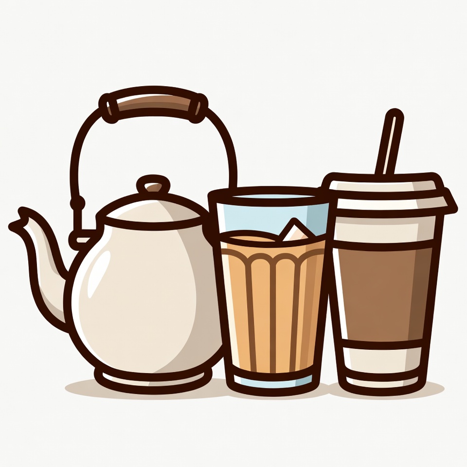 A clipart illustration features a white teapot with a curved spout and handle next to a tall orange-rimmed glass of tea with a sugar cube. A to-go coffee cup with a lid and straw stands beside them. All items are arranged on a plain white background with simple line art style.