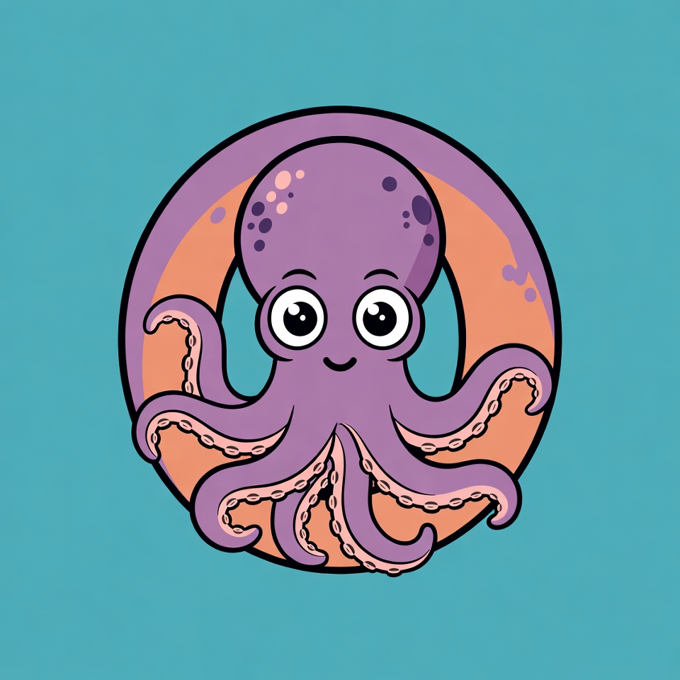 A purple cartoon octopus with big smiling eyes floats in an orange inflatable inner tube. The octopus has multiple tentacles draped over the tube's edges. The illustration is set against a solid turquoise background.