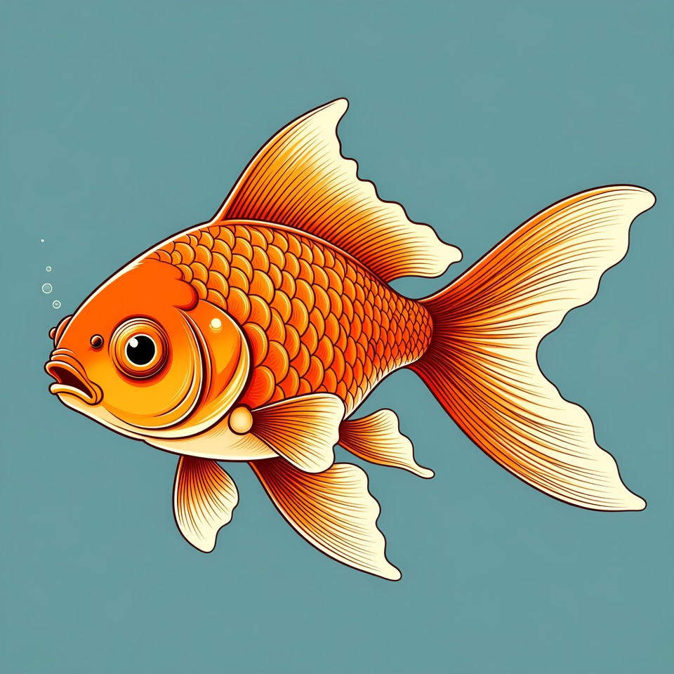 A vibrant orange goldfish with detailed scales swims on a solid blue background. It features large expressive eyes, flowing fins, and bubbles rising nearby. The illustration style is bold and graphic with white outlines.