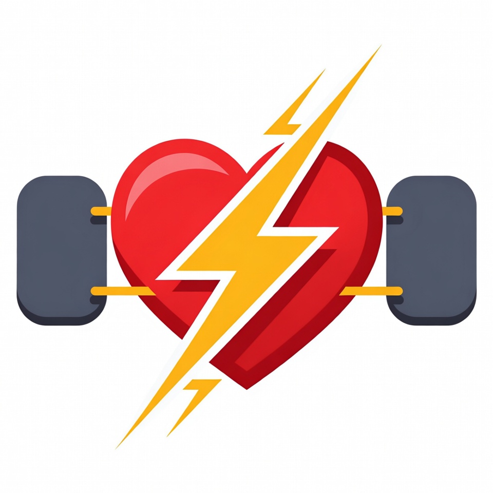A vibrant red heart icon features yellow lightning bolts striking through it. Black dumbbells are attached to both sides of the heart with gold chains. The illustration uses bold colors and a flat design style on a transparent background.