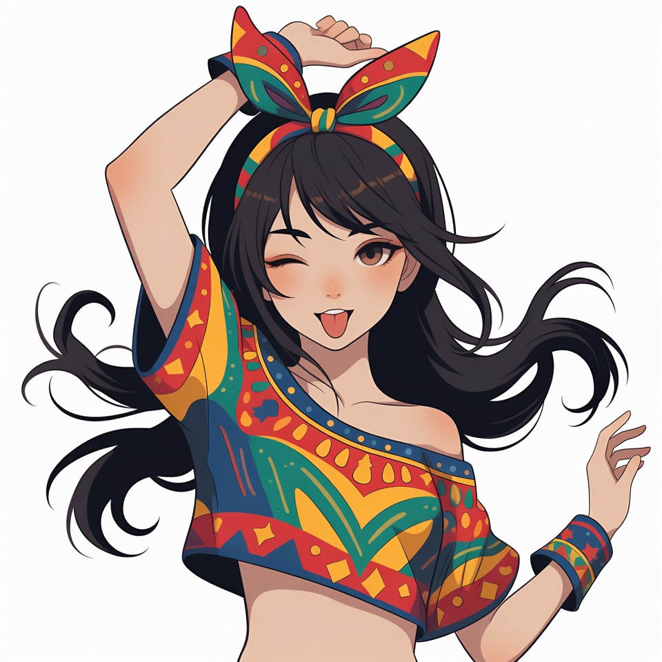 Asian, black hair, colorful headband, dancing, energetic pose, female, floppy headband, flushed cheeks, girl, illustration, isolated background, long hair, manga style, off-shoulder top, raised arms, red yellow green blue, smiling mouth, vibrant patterns, winking eye, wristbands, anime girl
