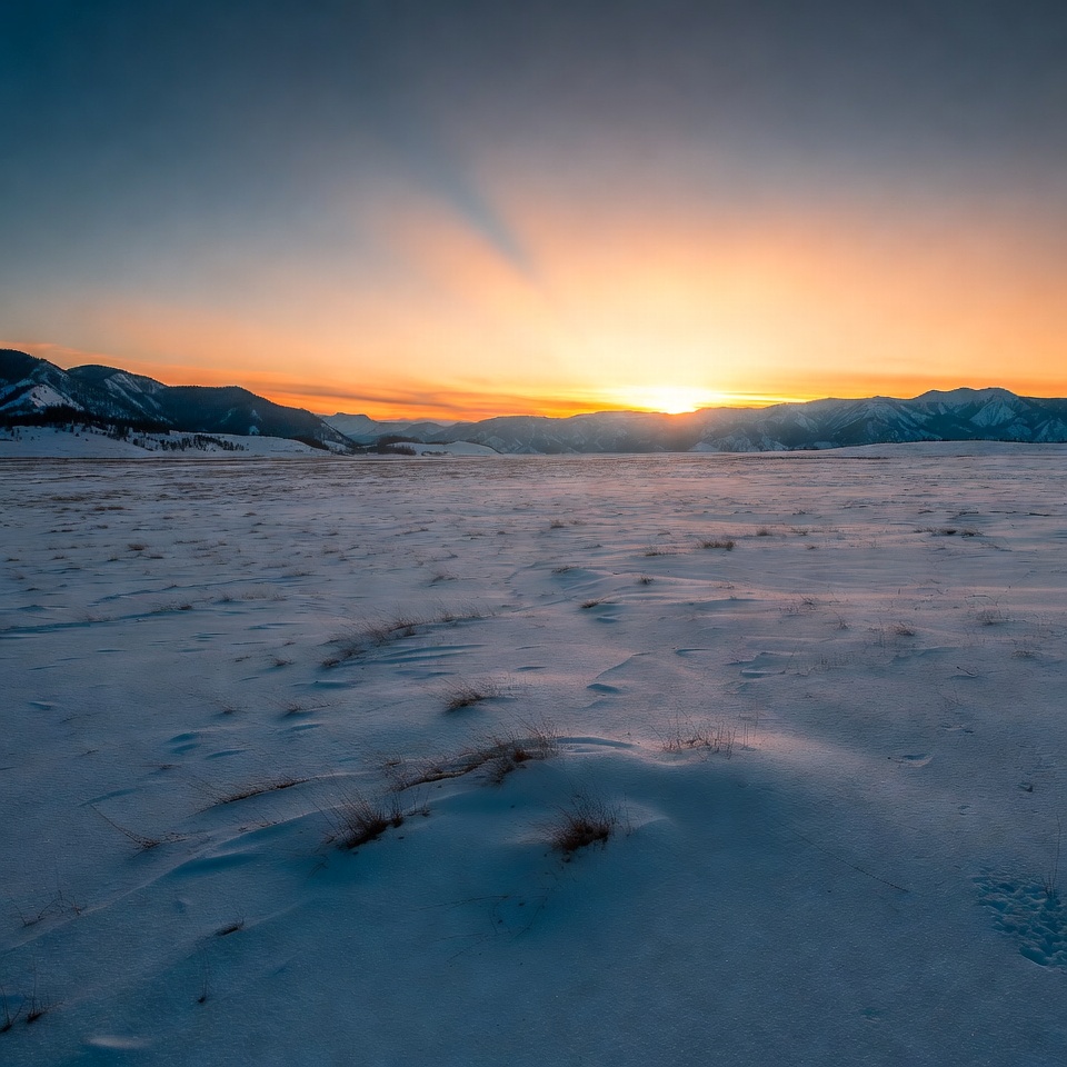 A vibrant sunrise illuminates snow-covered mountains with orange and pink hues in the sky. The foreground features a vast snowy field dotted with patches of dry grass. Sun rays streak across the clear blue horizon.