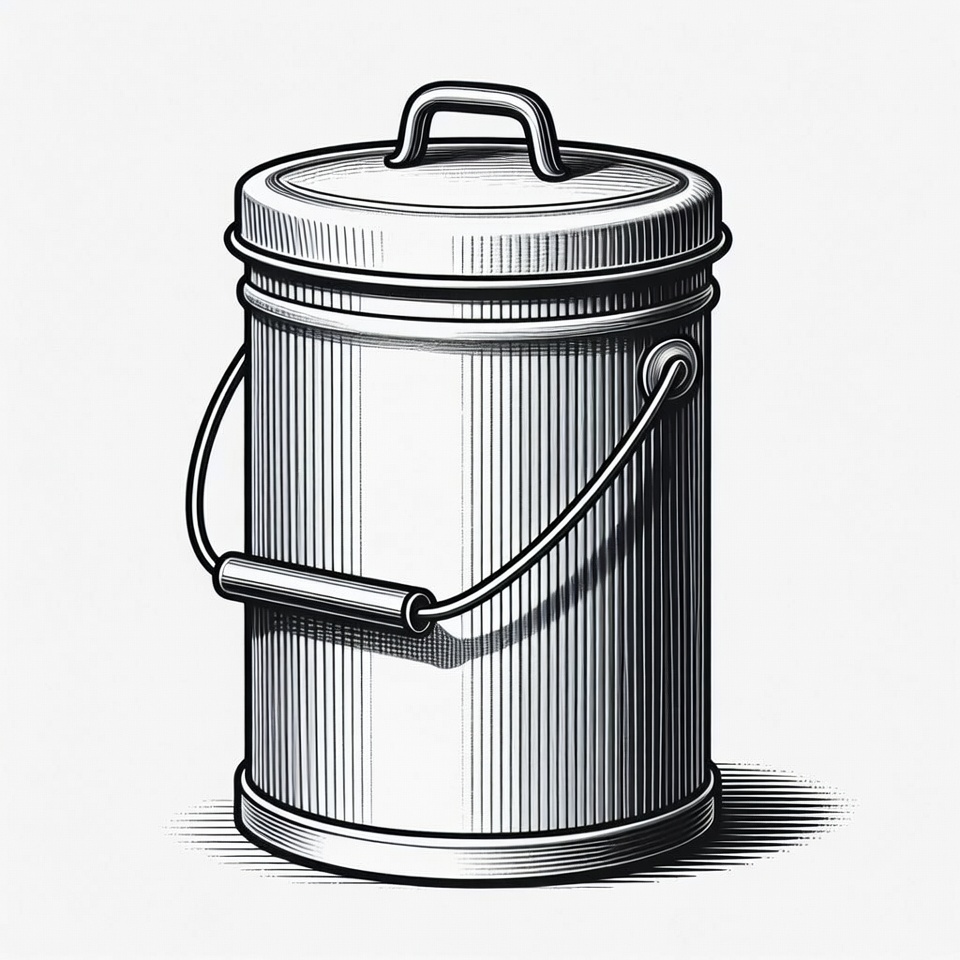 bucket, clipart, engraving style, garbage can, handle, illustration, isolated background, lid, line art, metal pail, ribbed texture, waste bin, trash can