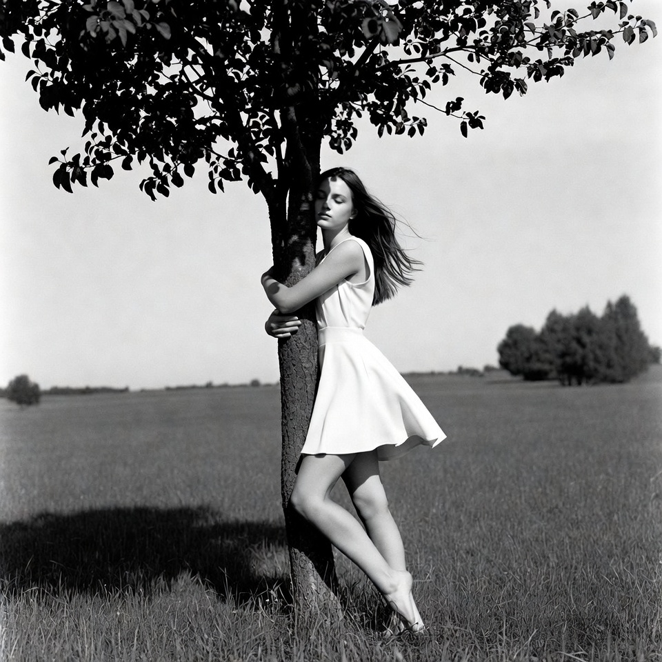 A young woman with long flowing hair embraces a large tree trunk in a vast grassy field. She wears a sleeveless white dress that flares out, standing barefoot with one leg lifted. The black and white photograph captures her against a clear sky with distant trees.