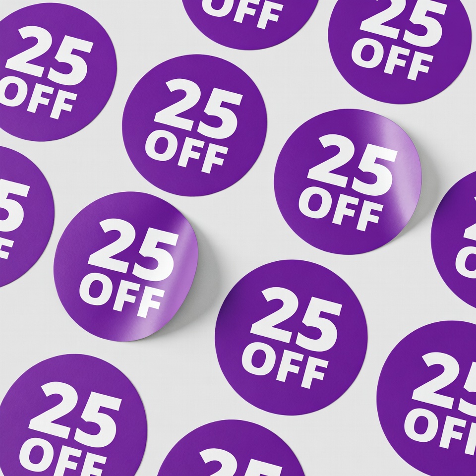 Multiple purple circular stickers with '25% OFF' text in white are scattered on a white background. The stickers have a glossy, realistic appearance with slight curling edges. They are arranged in a clustered pattern for promotional use.