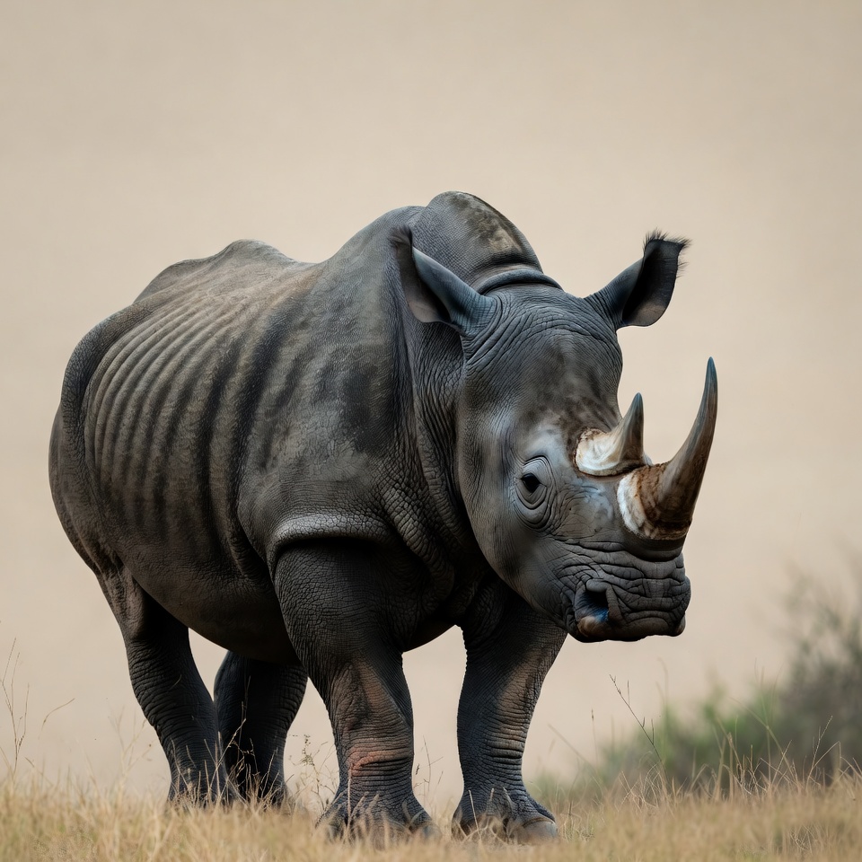 A large black rhinoceros stands on dry grassy terrain with a blurred beige background. Its thick grayish-black skin shows natural folds and creases, and it has a prominent front horn. The rhino faces slightly to the side with ears perked up.