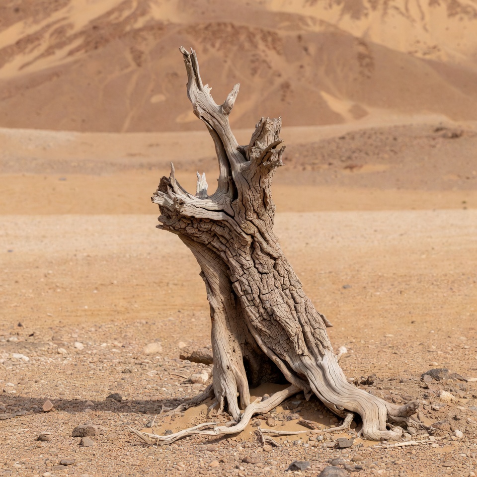 A gnarled dead tree with twisted branches and exposed roots stands in a vast sandy desert. Orange sand dunes rise in the background under a clear sky. The tree's bark is cracked and pale against the arid landscape.