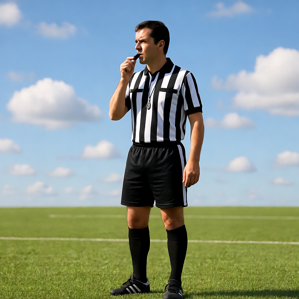 White, athletic man, black white stripes, blowing whistle, blue sky, cleats, clouds, field referee, football referee, green grass, male, outdoor sports, referee, shorts, soccer field, soccer socks, sports official, striped uniform, whistle, soccer referee
