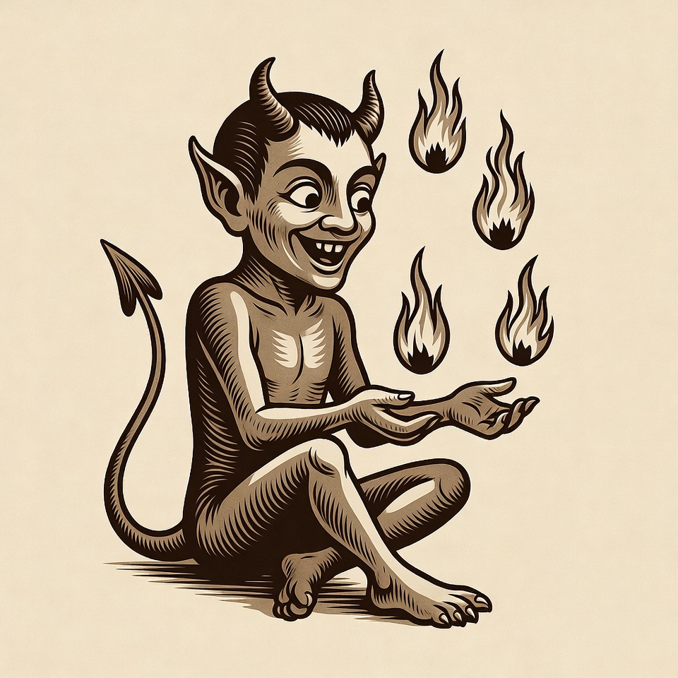A cartoon imp with horns, pointed ears, and a tail sits cross-legged while juggling five flaming fireballs. The illustration features bold black line art on a beige background with detailed shading. The imp has a mischievous grin and exaggerated features.