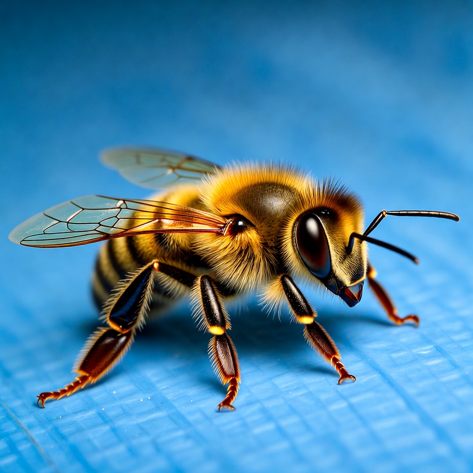 A detailed honey bee with yellow and black fur stands on a solid blue background. Its wings are slightly spread, and large compound eyes are prominently visible. The bee's legs and antennae are extended forward.