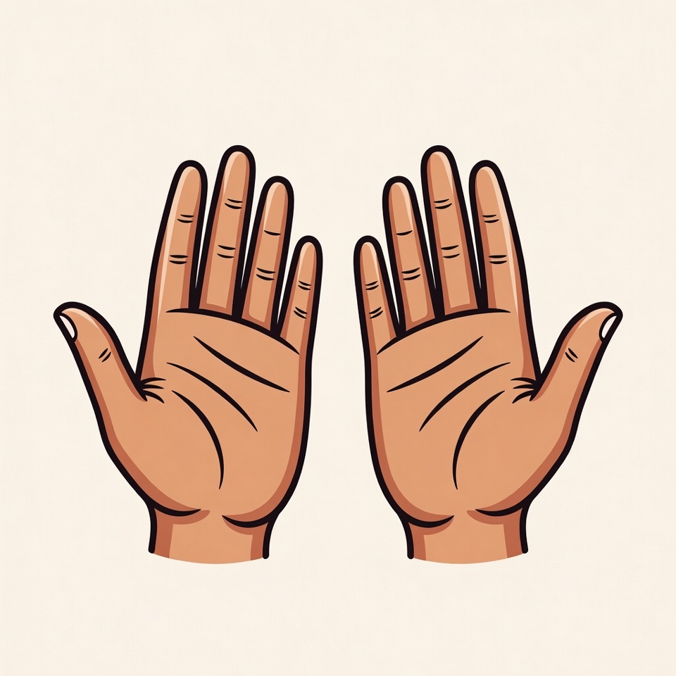 A colorful cartoon illustration shows two open human hands facing each other on a white background. The hands have outlined fingers and light brown skin tones with subtle shading. They are depicted in a simple, flat vector art style.