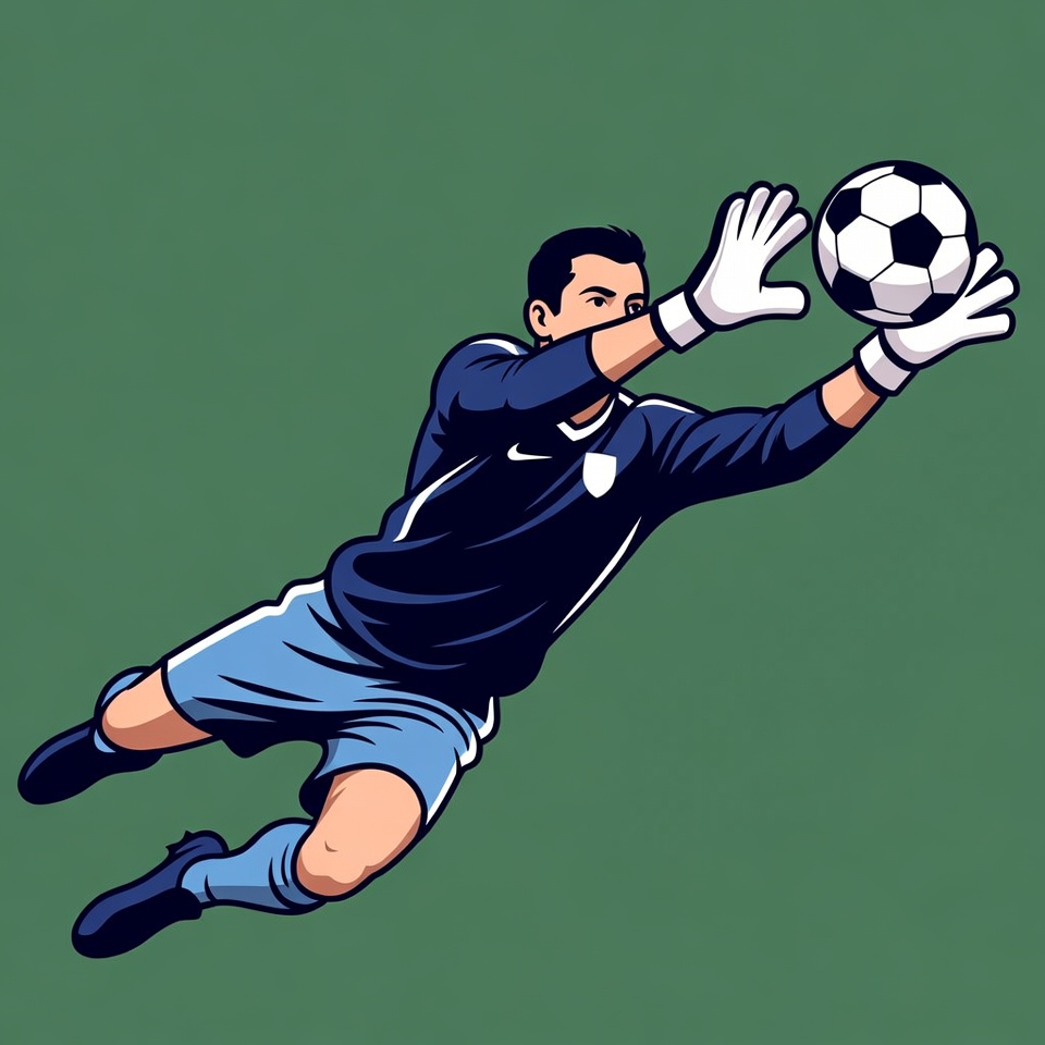 A cartoon illustration of a male soccer goalkeeper diving to catch a soccer ball. He wears a dark blue jersey with white accents, light blue shorts, and white goalkeeper gloves. The figure is set against a solid green background.