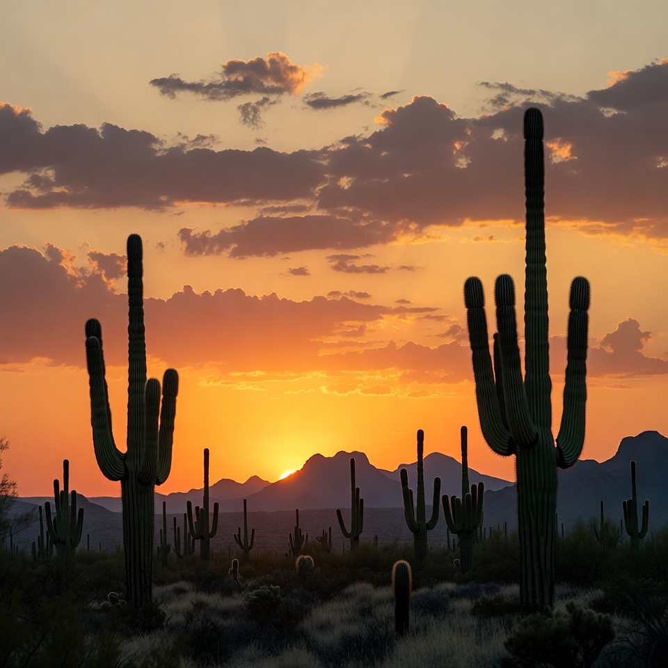 Arizona, arid, cacti, clouds, desert, dusk, golden hour, horizon, landscape, mountains, nature, orange sky, plants, rocky, sand, scenery, scenic view, silhouette, sun, sunset, terrain, vegetation, warm light, wilderness, saguaro cactus