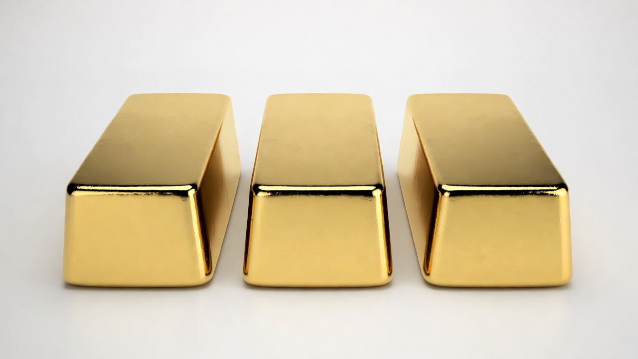 Three shiny gold bars are arranged in a row on a plain white background. Each bar has a rectangular shape with smooth, reflective surfaces. The gold color gleams brightly under even lighting.