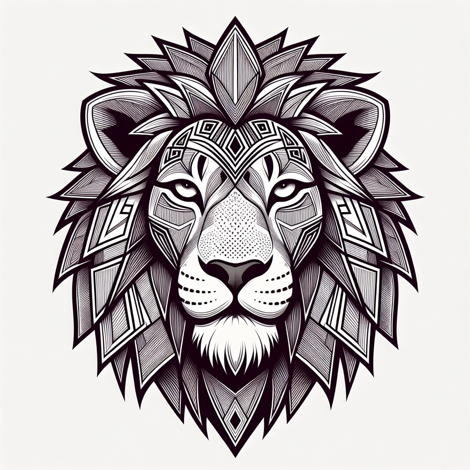A detailed black and white illustration of a lion's head features intricate geometric patterns forming the mane and facial features. The design uses sharp angles, diamonds, and lines for a modern, symmetrical look. The lion stares forward with intense eyes on an isolated white background.