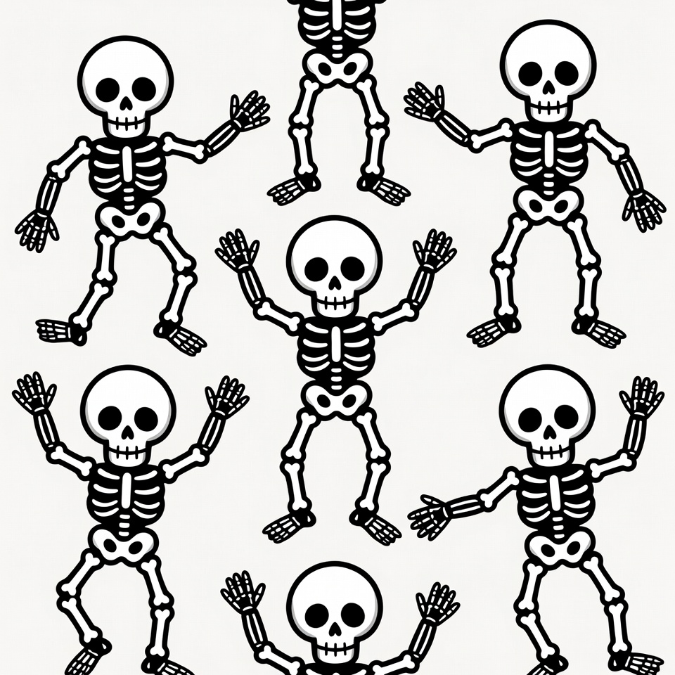 Halloween, arms raised, black white, bones, cartoon, cartoon skeleton, clipart, dancing skeletons, fun, illustration, isolated background, line art, multiple skeletons, skeletons, skull, spooky, skeleton