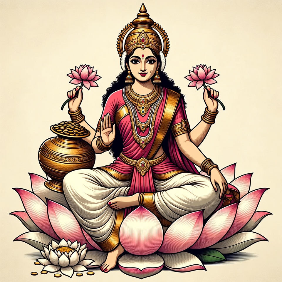 Hindu deity, crown, divine woman, four arms, goddess, gold jewelry, golden pot, illustration, isolated background, lotus flower, pink lotus, prosperity goddess, red sari, sari, sitting, wealth symbol, Lakshmi