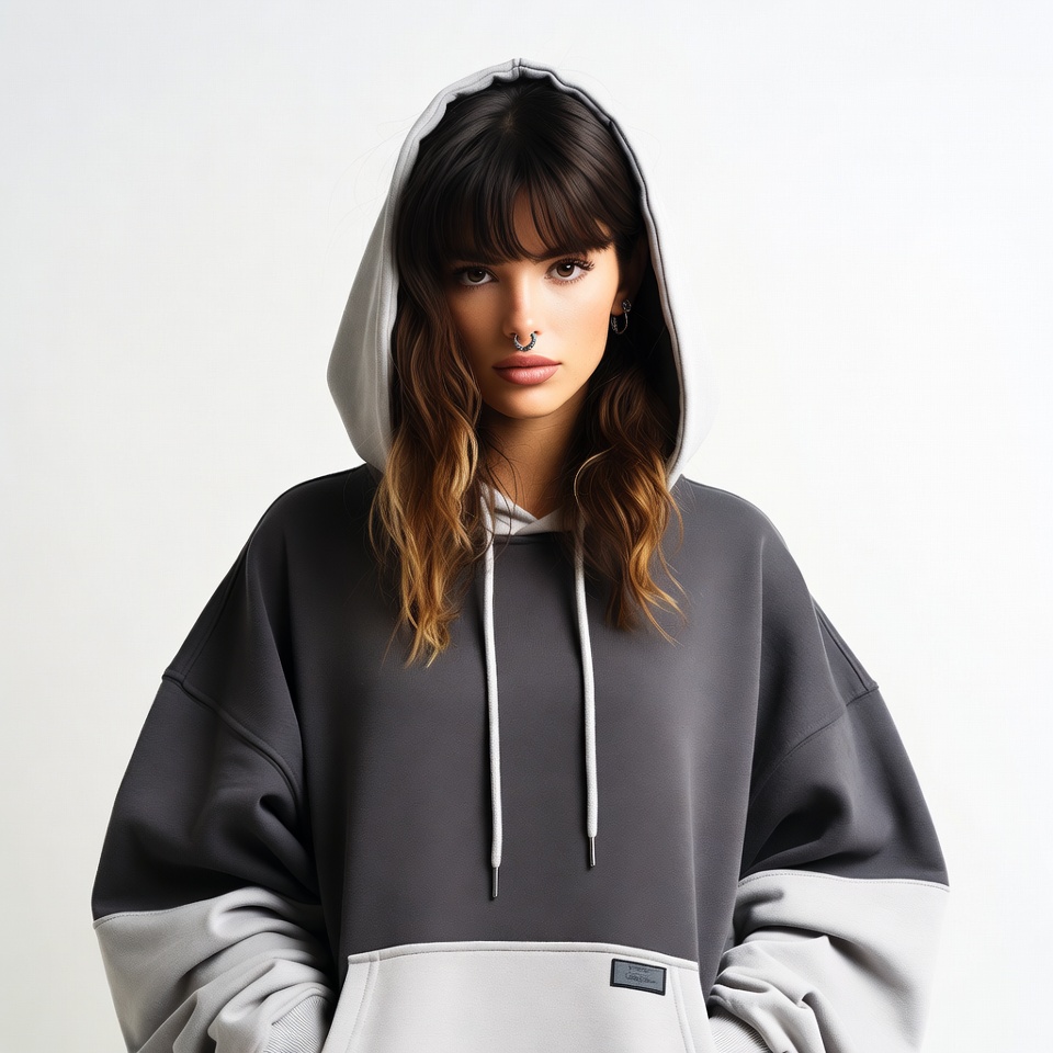 A young woman with long wavy brown hair and bangs wears an oversized gray hoodie with white hood and sleeves. She stands against a white background, gazing directly at the camera with subtle lip makeup and an earring. Her expression is confident and poised.