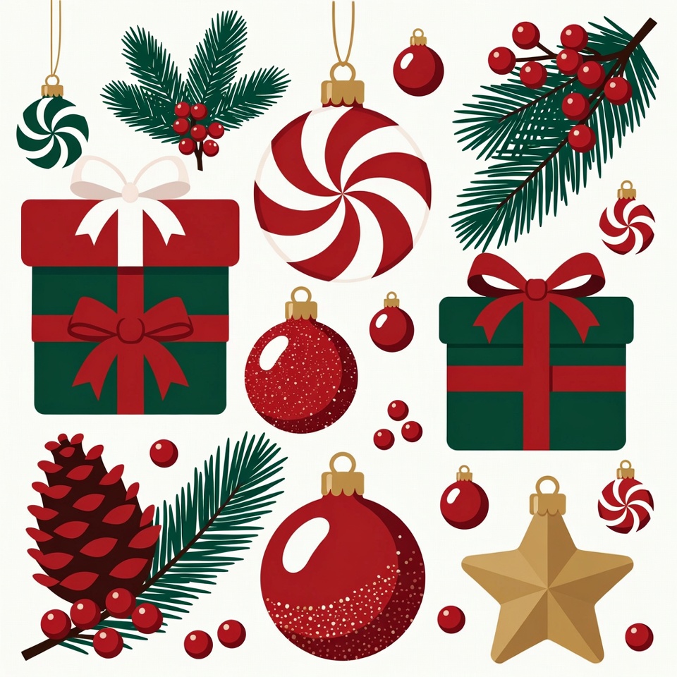Christmas decorations, Christmas vector, berries, candy cane, candy canes, evergreen, festive elements, fir branches, gift boxes, gifts, gold star, green gifts, holiday clipart, holiday ornaments, holly, holly berries, isolated background, ornaments, pine cone, pine cones, red gifts, red ornaments, ribbons, star, vector illustration, white background, Christmas clipart
